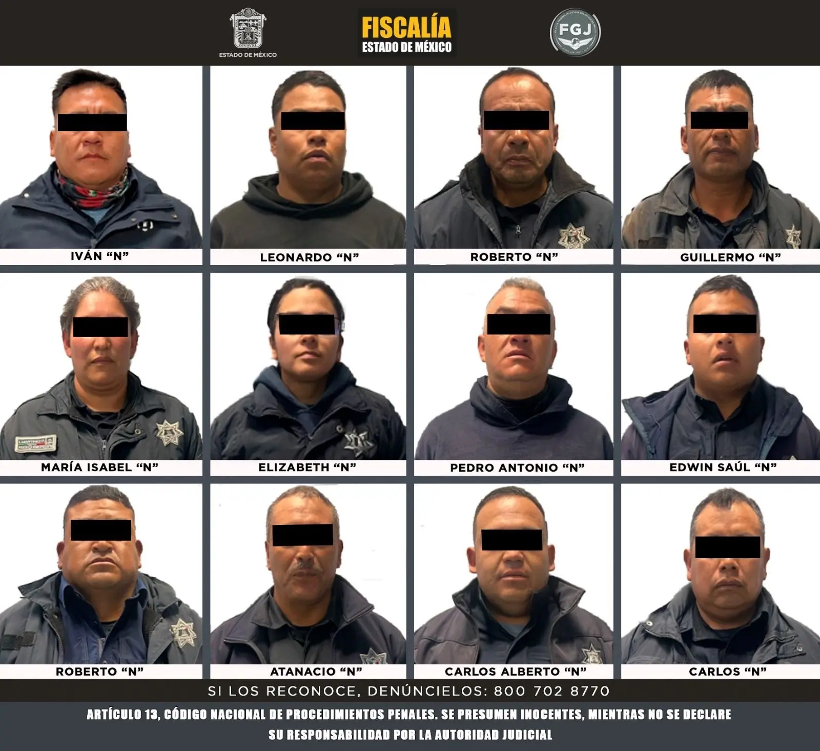 Los 12 elementos de la Policía Municipal, incluyendo 10 hombres y 2 mujeres, y al Director de Seguridad Pública Municipal, Iván «N», fueron formalmente imputados por la Fiscalía General de Justicia del Estado de México (FGJEM) por los delitos de homicidio y homicidio en grado de tentativa.
